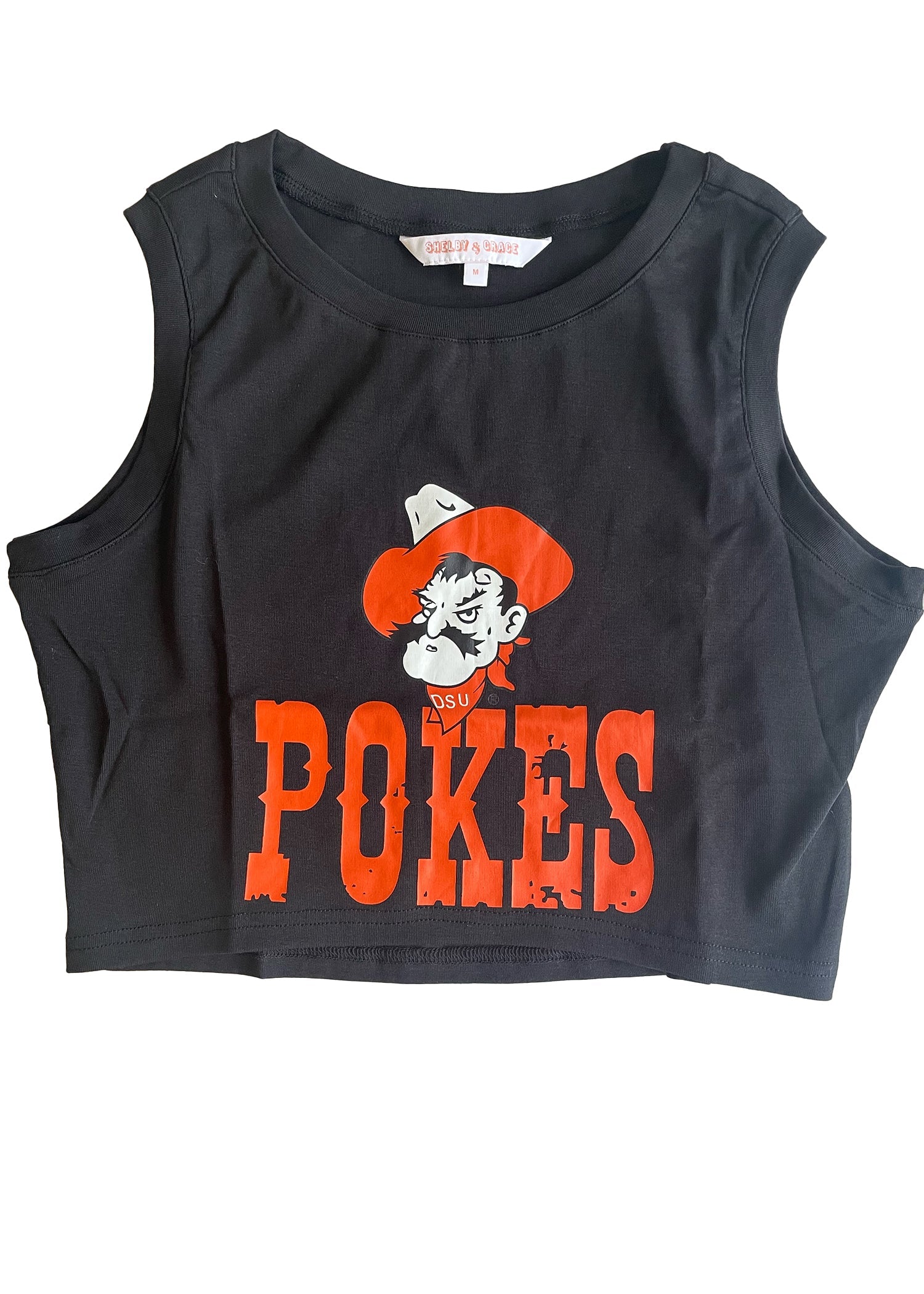 This junior contemporary fit crop top is a sleeveless, fitted style made from soft, lightweight fabric in black. The front features a large Oklahoma State University logo, featuring Pistol Pete, and 'POKES"in distressed lettering, giving the top a sporty, vintage-inspired look. The cropped cut hits above the waist, making it perfect for pairing with high-waisted shorts, jeans, or leggings, and the round neckline offers a casual, comfortable fit ideal for game days or everyday wear.